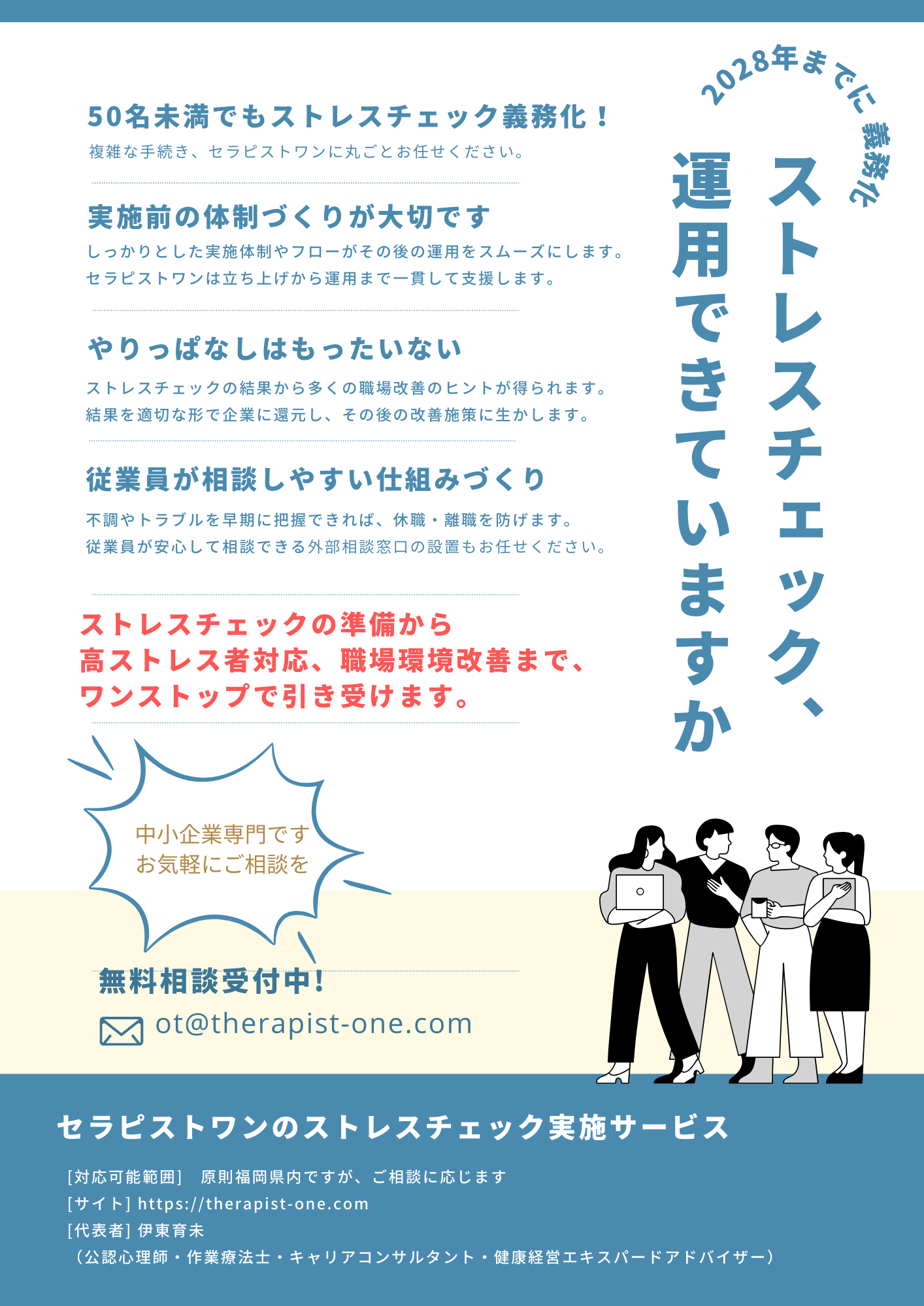 セラピストワンの健康経営支援事業の一つである、ストレスチェック実施サービスのチラシです。