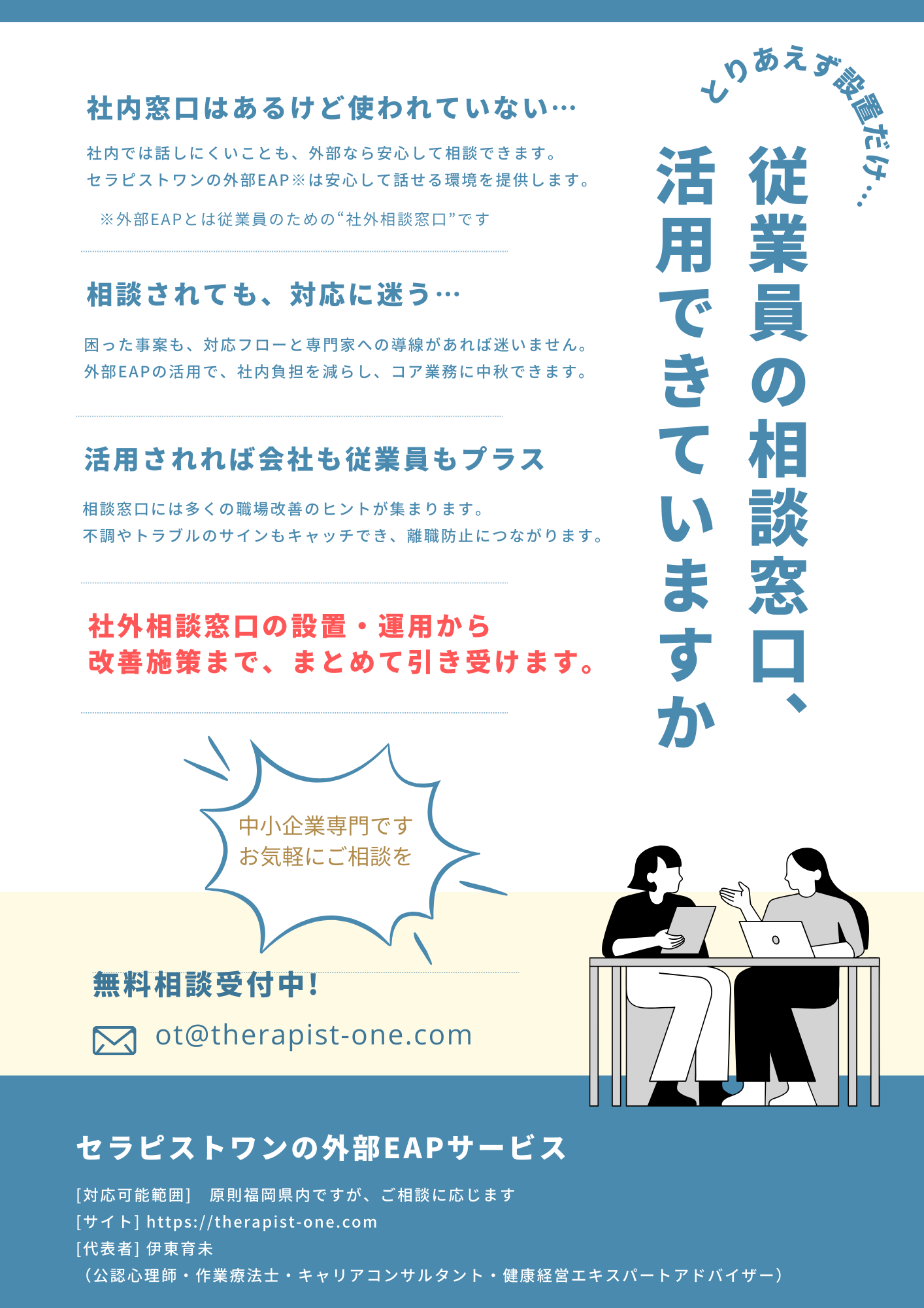 セラピストワンの健康経営事業の一つである、従業員支援プログラム(EAP):外部相談窓口サービスのご案内チラシです。