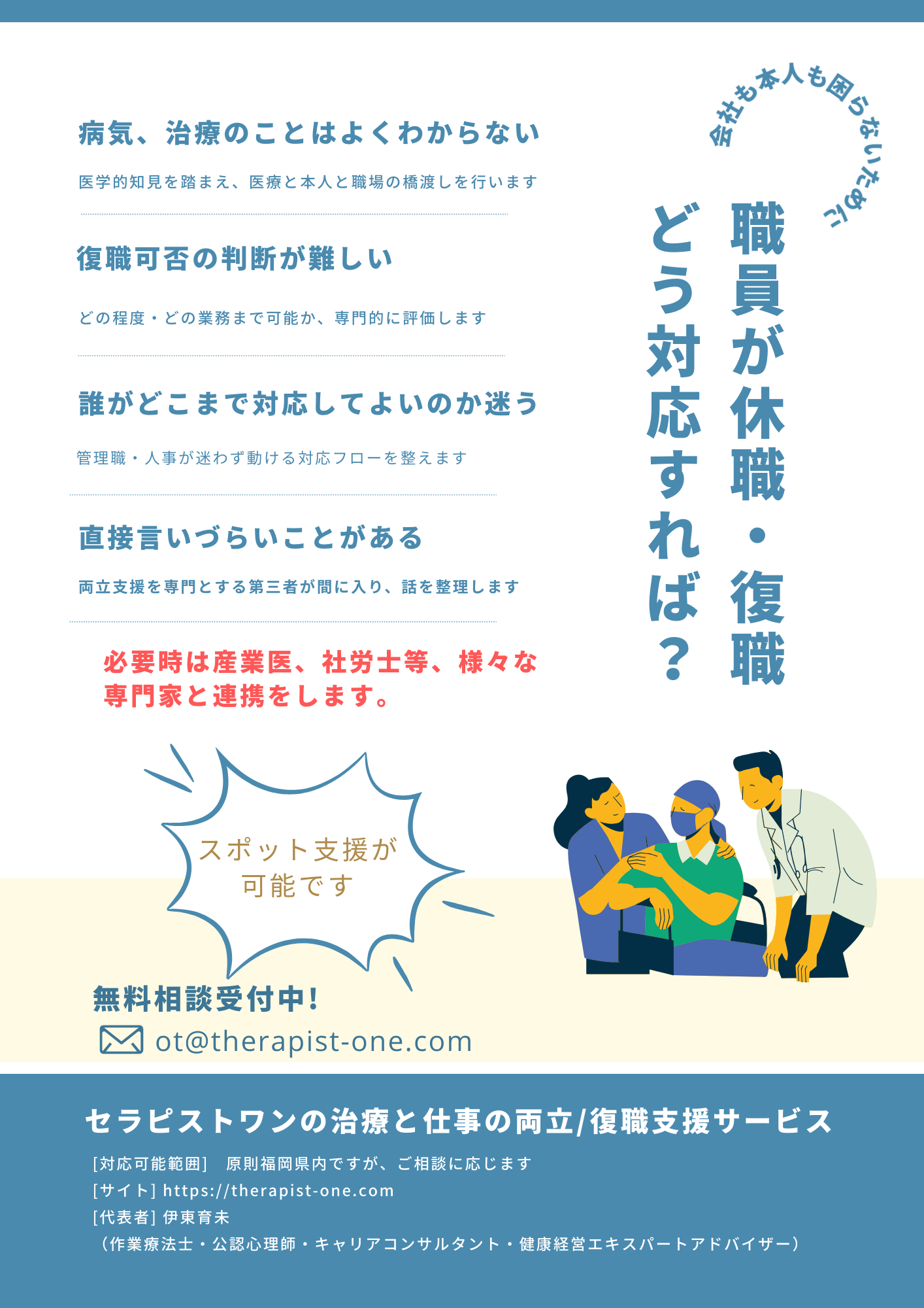 セラピストワンの健康経営支援事業の一つである、治療と仕事の両立/復職支援サービスのご案内チラシです。
