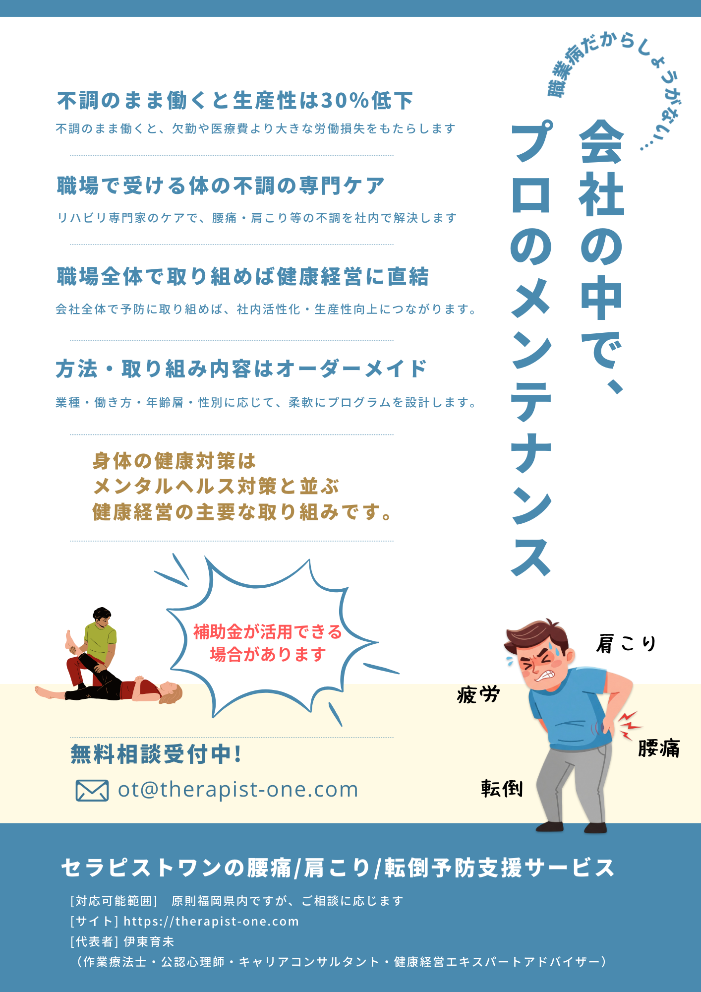 セラピストワンの健康経営支援事業の一つである、腰痛/肩こり/転倒予防支援サービスのご案内チラシです。